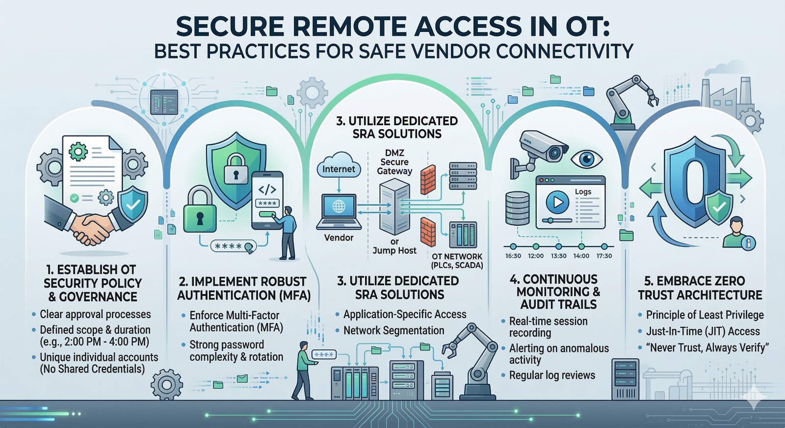 To mitigate these risks, organizations must implement a comprehensive strategy for safe vendor connectivity. Here are key best practices for securing remote access in OT: