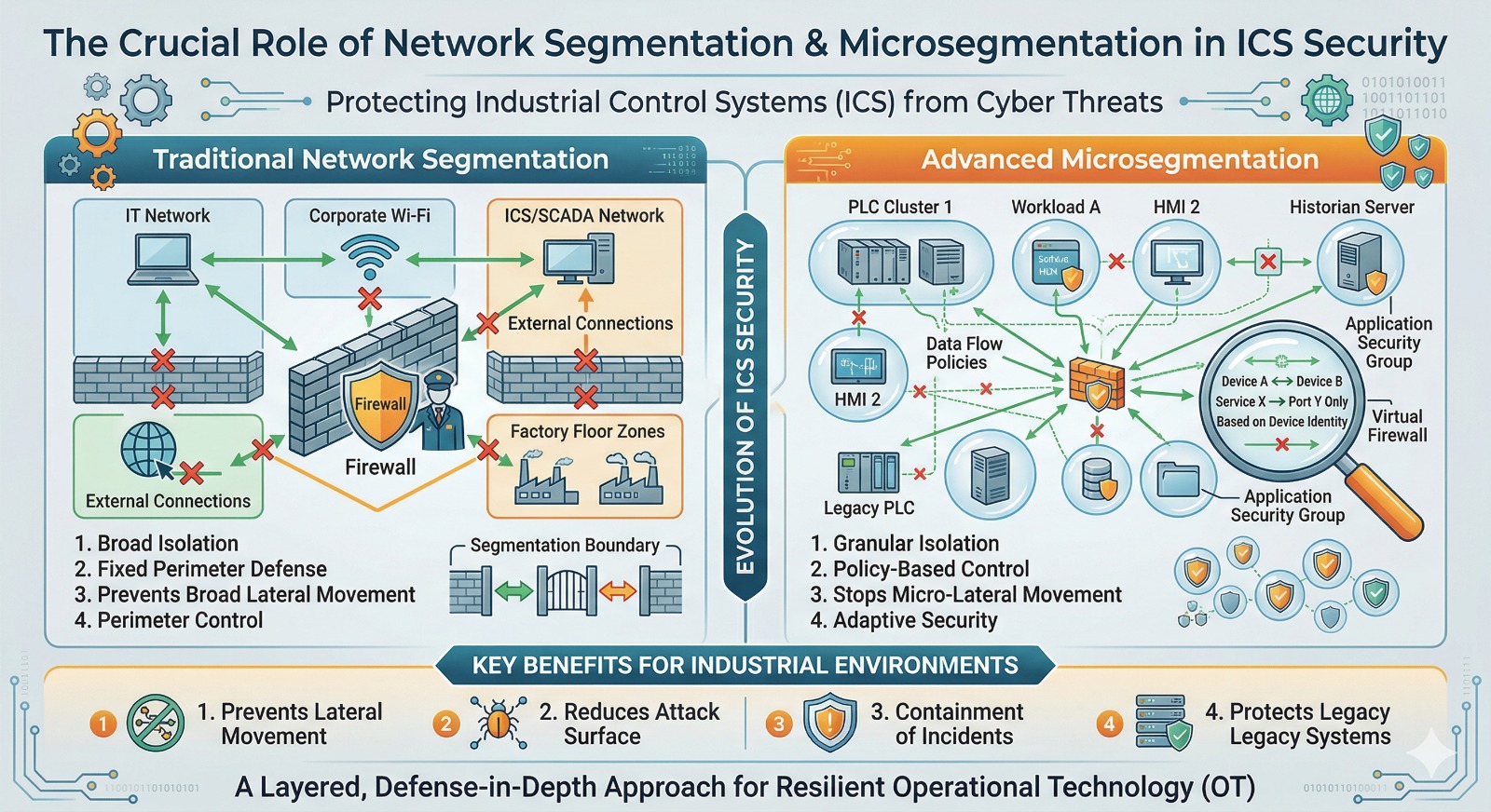 Network segmentation and microsegmentation are not competing technologies; they are complementary. An effective ICS security architecture uses a layered approach: